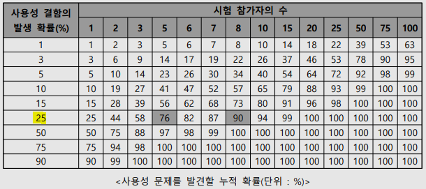 표에 따르면 특정 사용성 결함의 발생 확률이 25%일 경우, 5명의 참가자만으로 약 76%의 문제를 발견할 수 있으며 8명으로 확장하면 90% 이상의 문제를 파악할 수 있습니다. 그러나 8명 이상부터는 문제 발견 확률의 증가율이 점진적으로 줄어들기 때문에 비용과 시간 효율성을 고려한 최적의 참가자 수 산정이 중요합니다.